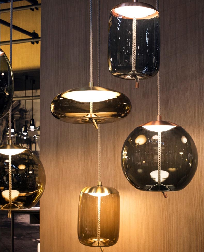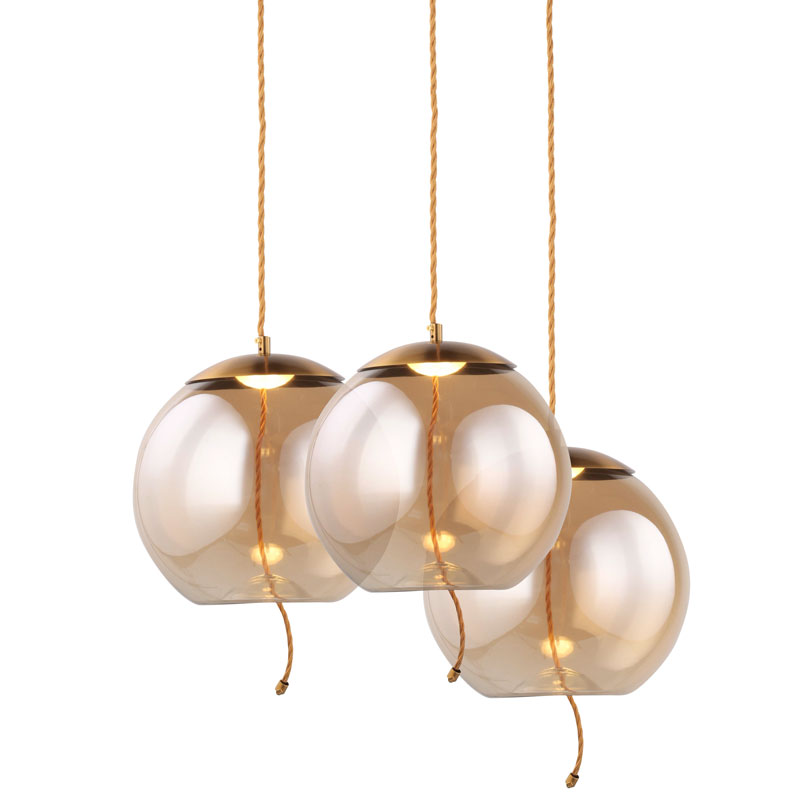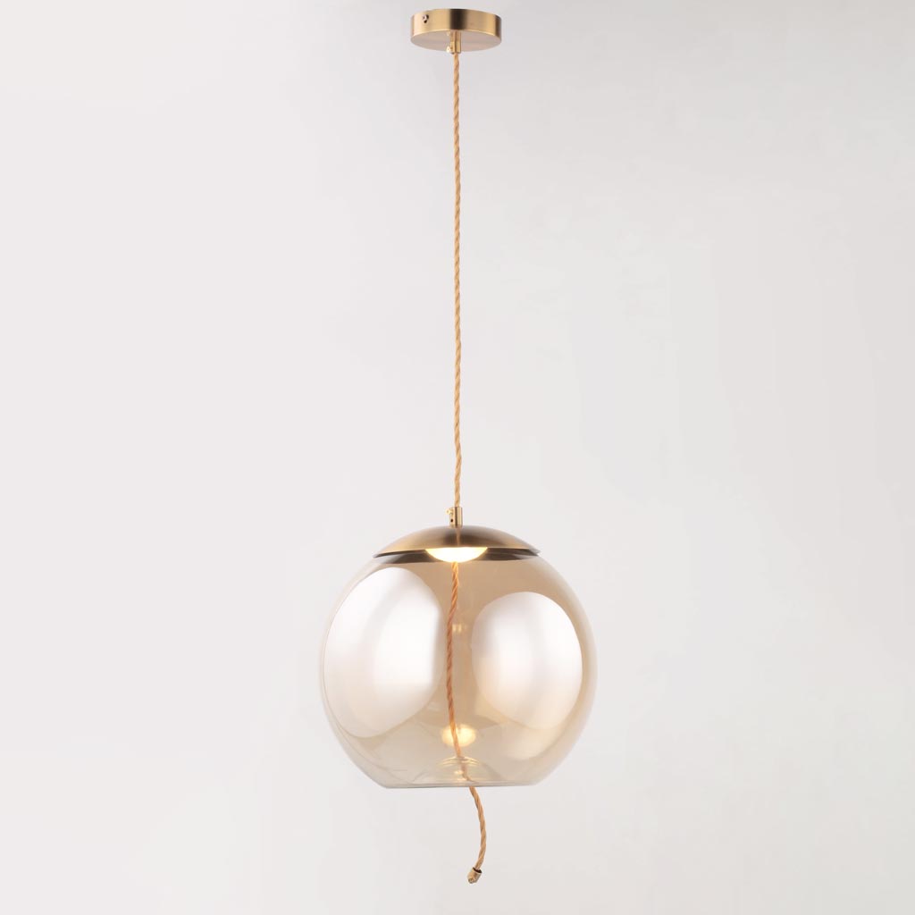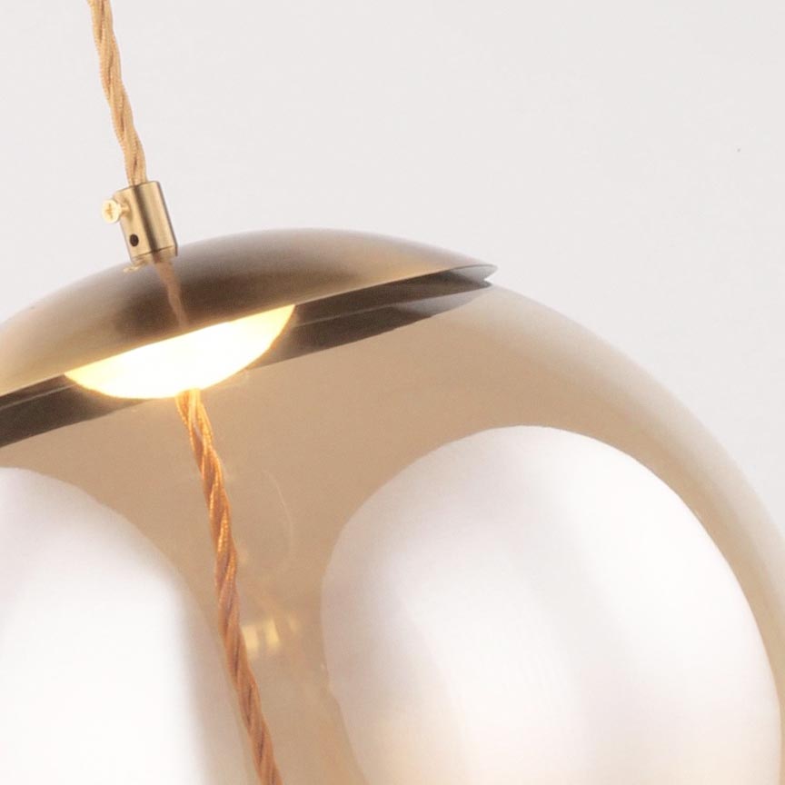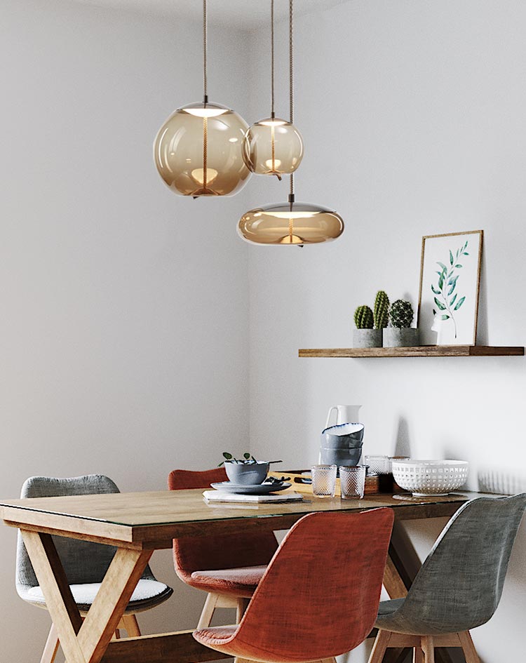 Thủy tinh luôn là một trong những chất liệu được yêu thích nhất trên đèn trang trí bàn ăn. Thủy tinh vừa bóng bẩy vừa mềm mại dưới ánh sáng. Chiếc đèn thả trang trí sử dụng chao đèn tròn, trong suốt và được ám màu vàng tối sang trọng. Nhờ kiểu dáng hiện đại này, chiếc đèn rất dễ ứng dụng và hài hòa với hầu hết phong cách bàn ăn, nội thất.