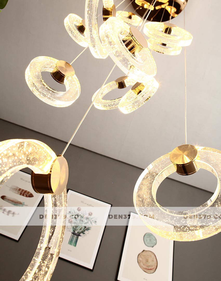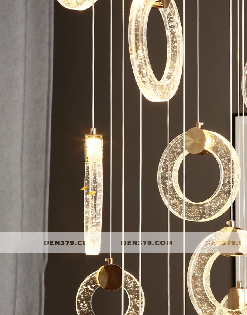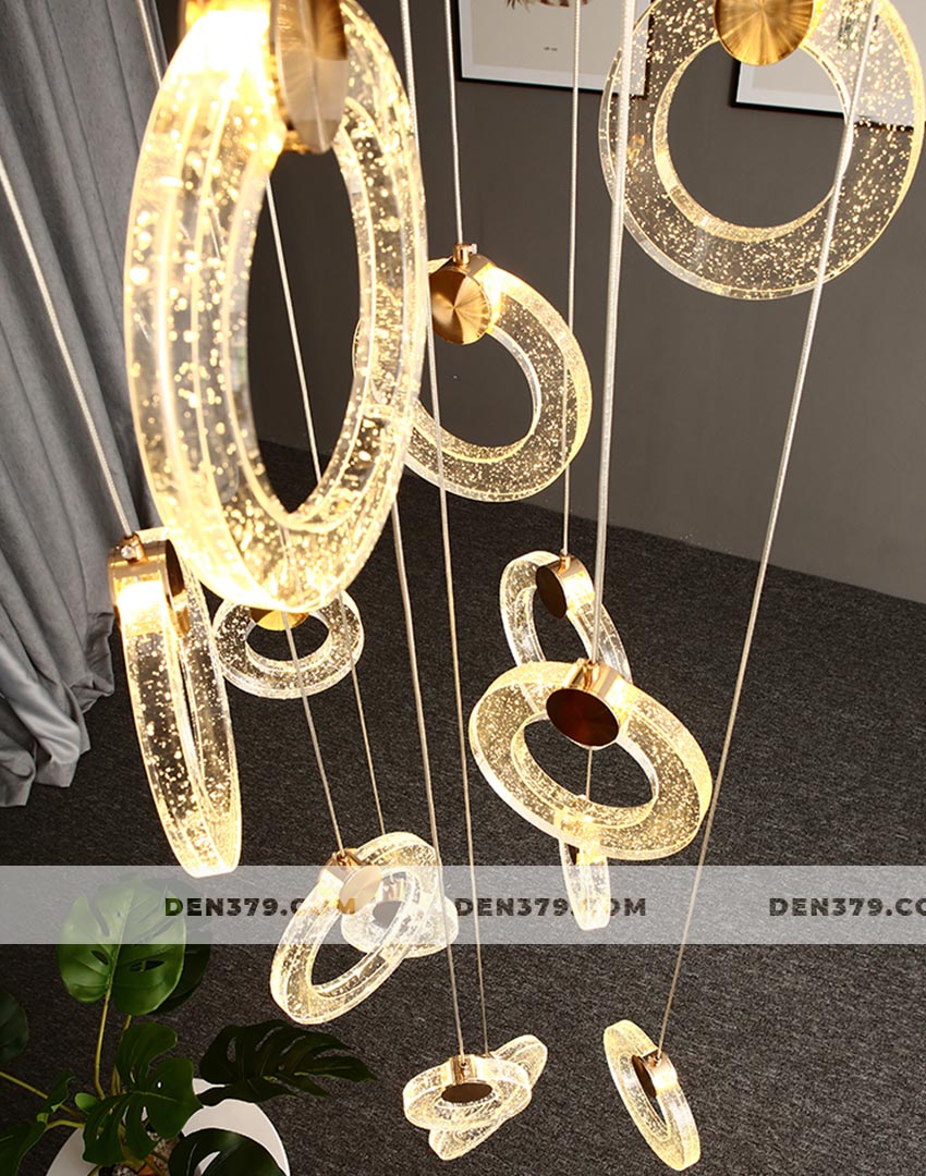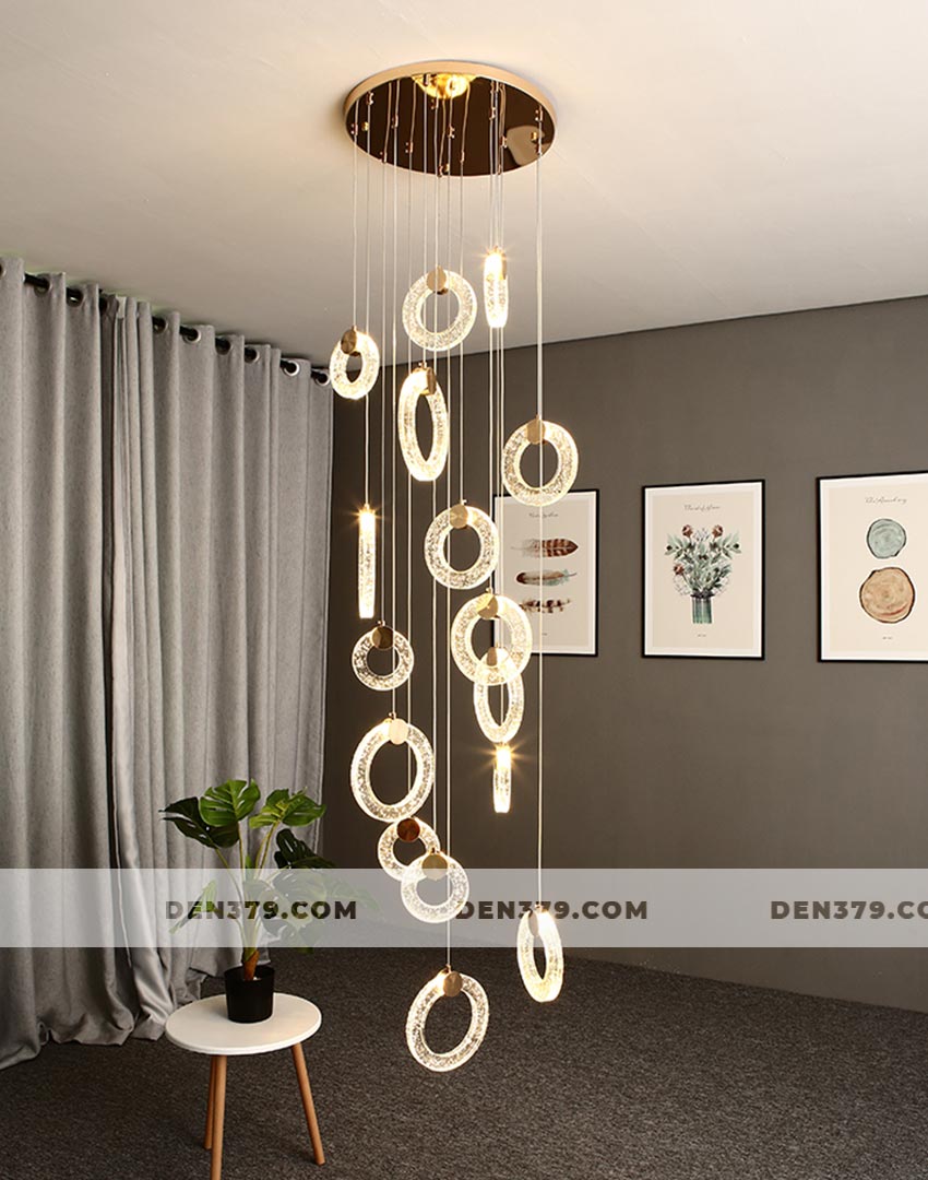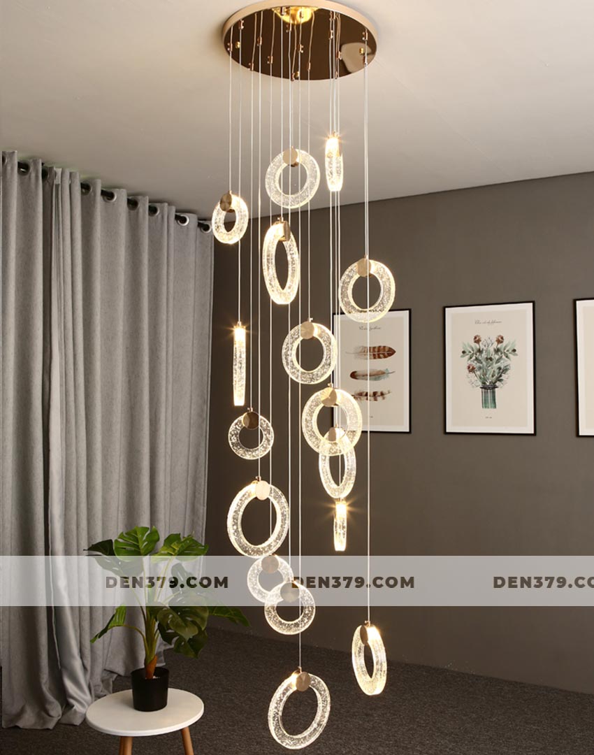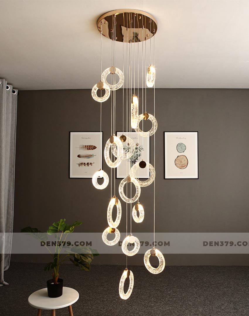 Bộ đèn thả vòng tròn pha lê như một dãi lụa ánh sáng chảy xuống không gian của bạn. Chiếc đèn mang đến vẻ lắp lánh và sang trọng tuyệt vời tại khu vực thông tầng cầu thang. Ngoài ra, bộ đèn cũng được ứng dụng tại các căn phòng có trần cao.