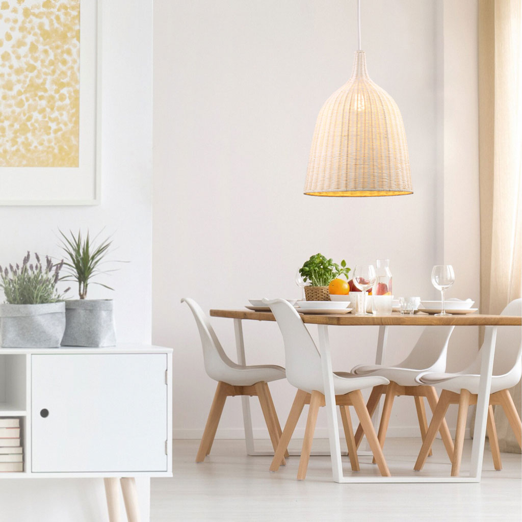 Chiếc đèn thả sử dụng tre Việt Nam làm vật liệu chính để tạo hình. Đèn được đan thủ công với vẻ ngoài hoàn thiện đẹp mắt. Sản phẩm phù hợp với không gian của các gia đình Việt. Chiếc đèn có thể ứng dụng đẹp mắt tại nhiều không gian như bàn ăn, quán ăn, nhà hàng hay quán cafe. Sản phẩm sản xuất tại Việt Nam và đi kèm bóng khi mua tại den379.com.