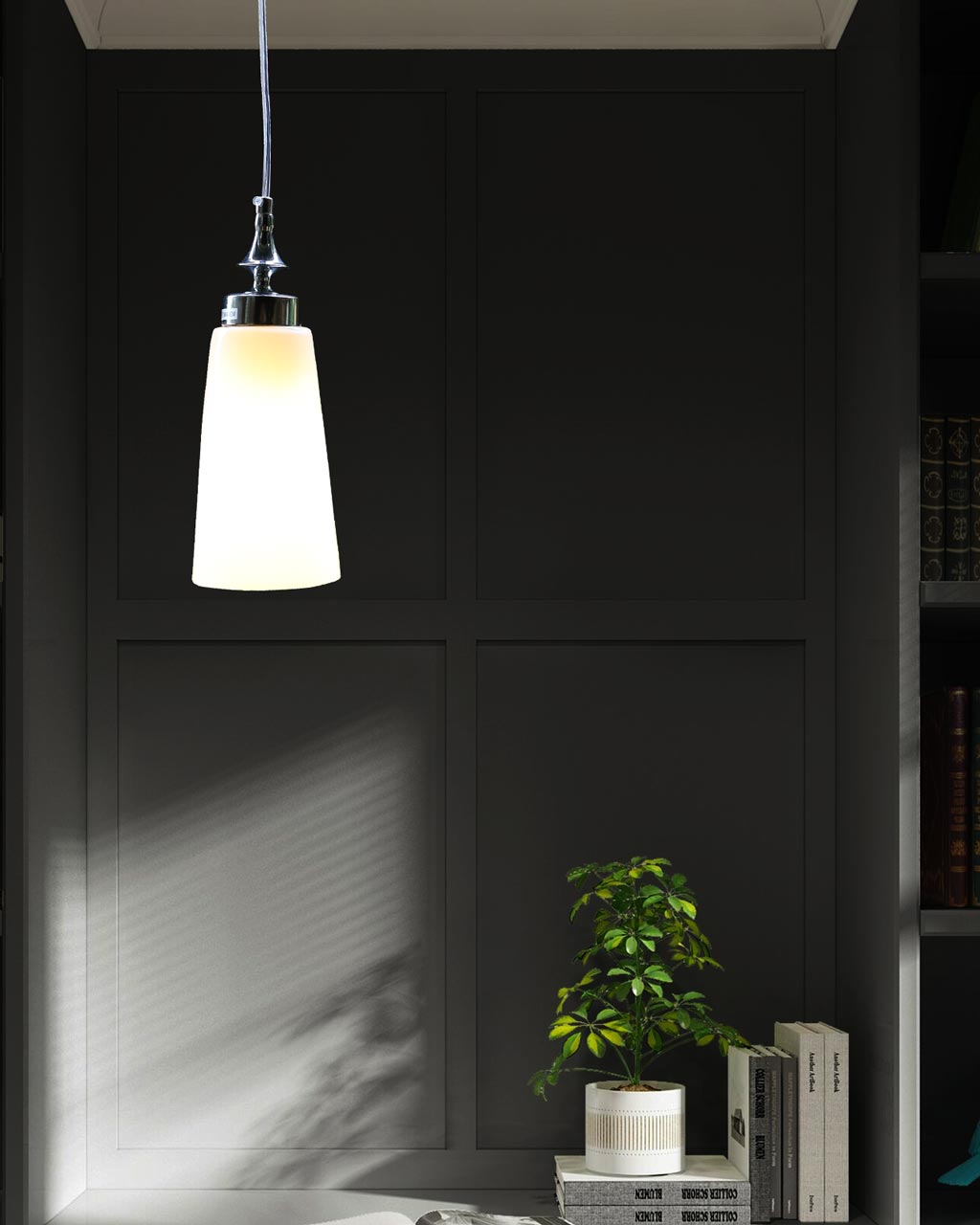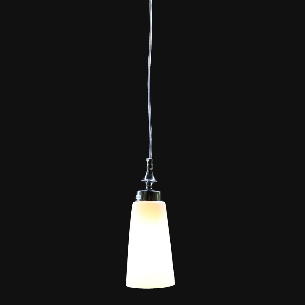 Mẫu đèn trang trí mang trong mình phong cách đơn giản. Chao đèn thủy tinh màu trắng cùng chuôi hợp kim sáng bóng thanh lịch. Bạn có thể dùng để chiếu sáng và trang trí cho bàn ăn, bàn đầu giường ngủ… hay một số vị trí khác trong gia đình của mình.