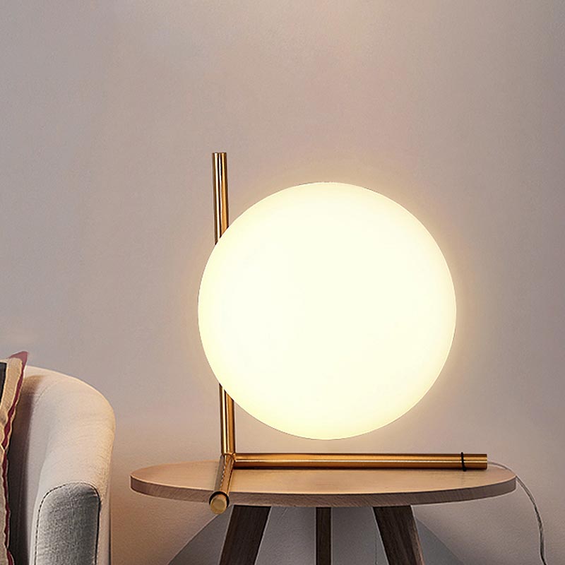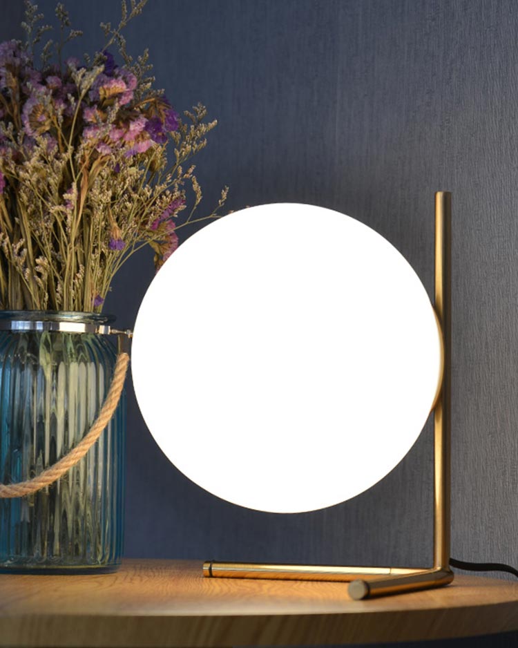 Chiếc đèn bàn trang trí làm sáng bừng mọi không gian với vẻ đẹp vô cùng sang trọng và tinh tế. Đèn sử dụng chao bằng thủy tinh và thân hợp kim xi màu vàng bóng cao cấp. Chiếc đèn bàn cho ánh sáng dịu nhẹ mô phỏng ánh sáng dễ chịu từ mặt trăng. Bạn có thể ứng dụng chiếc đèn này ở mọi nơi thật đẹp mắt từ phòng khách, phòng ngủ hay bàn làm việc.