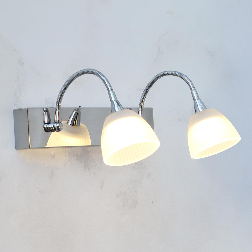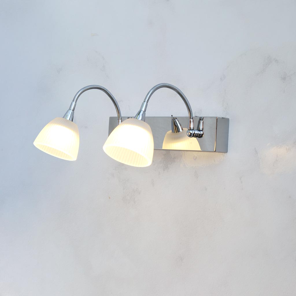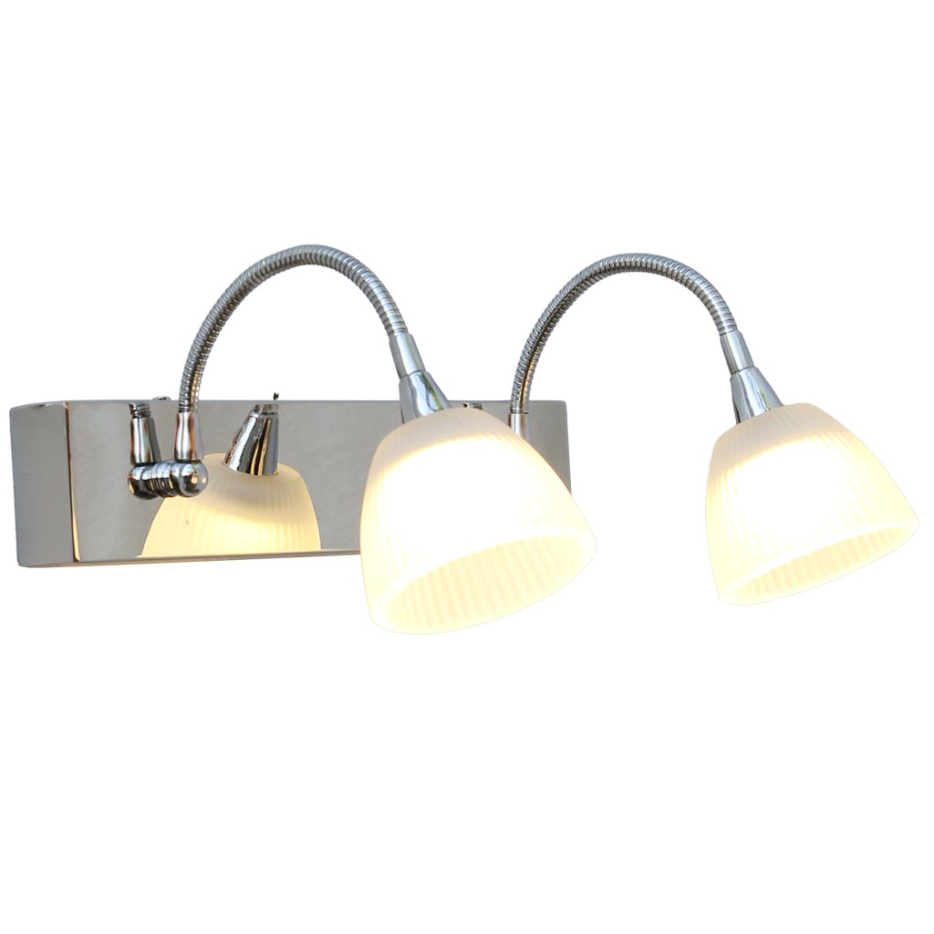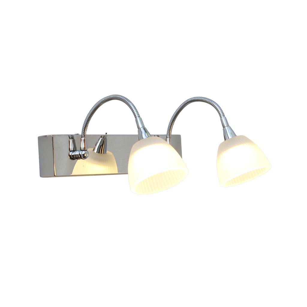 Đèn gắn tường 2 bóng dùng để soi tranh và gương. Đèn có chao bằng thủy tinh giúp làm mềm ánh sáng. Bóng đèn LED ánh sáng ấm giúp các bức tranh trở nên thật sinh động. Đặc biệt các tay đèn có thể thay đổi linh hoạt góc chiếu sáng.
