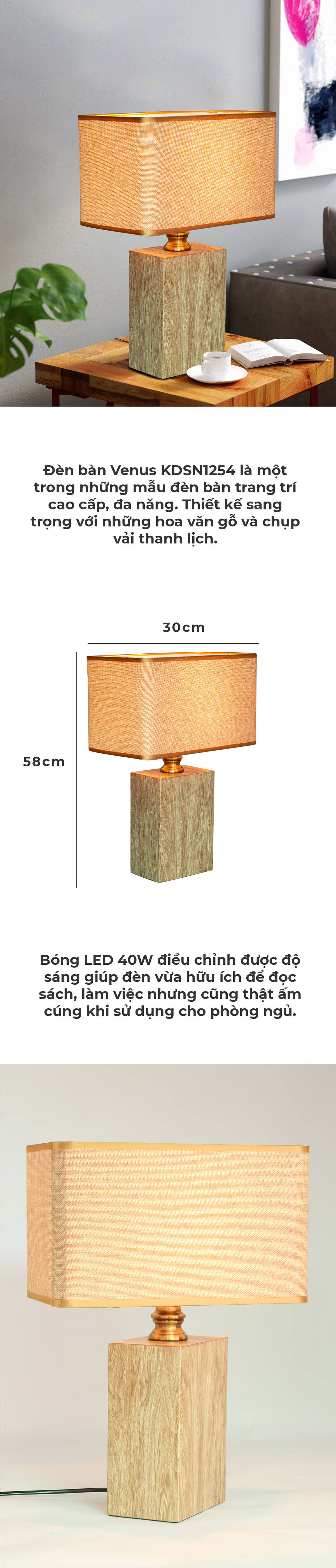 Đèn bàn Venus KDSN1254 mang nét hoa văn gỗ đầy sang trọng và ấm cúng cho căn phòng của bạn. Đèn sử dụng bóng công suất 40W cho phép điều chỉnh độ sáng dễ dàng. Ánh sáng thích hợp cho đọc sách, ghi chép hay làm việc. Khi sử dụng như đèn ngủ, bạn có thể chỉnh ánh sáng thấp nhất, cung cấp ánh sáng và tạo cảm giác thoải mái cho giấc ngủ của bạn.