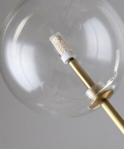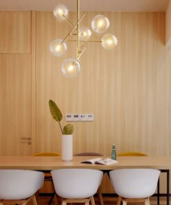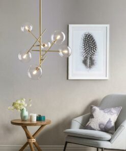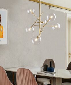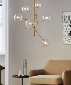 Đèn chùm thủy tinh 6 bóng sử dụng sử dụng chao đèn thủy tinh trong suốt, mang lại vẻ long lanh cho căn phòng. Chiếc đèn còn có thân đèn màu vàng óng làm điểm nhấn tuyệt vời.
