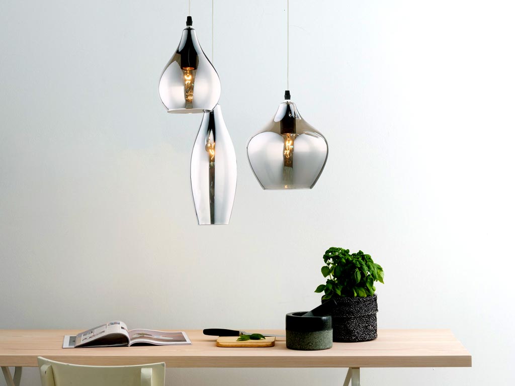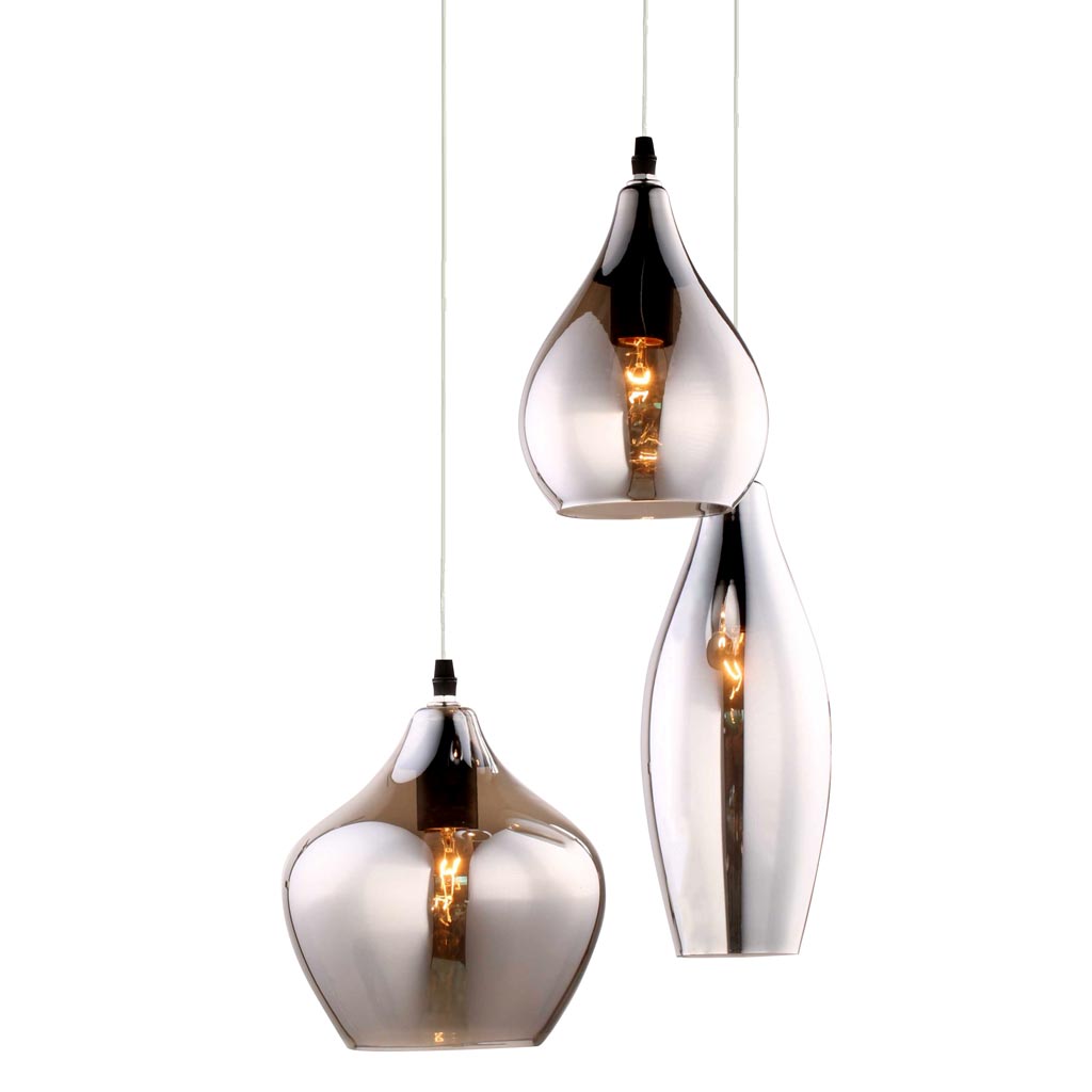 Bộ đèn thả trang trí tuyệt đẹp cho bàn ăn. Bộ đèn sử dụng chất liệu thủy tinh với 3 kích thước lần lượt là 13, 14 và 20cm. Sản phẩm mang màu thủy tinh khói được được ưa chuộng hiện nay. Chiếc đèn đem lại dáng vẻ sang trọng tuyệt vời cho bàn ăn, quầy bar. Chụp đèn được thiết kế cho ánh sáng tập trung xuống bàn ăn, giúp không khí bữa ăn ấm cúng hơn. Bề mặt thủy tinh còn phủ gương nhẹ, giúp phản chiếu lung linh mọi hình ảnh xung quanh.