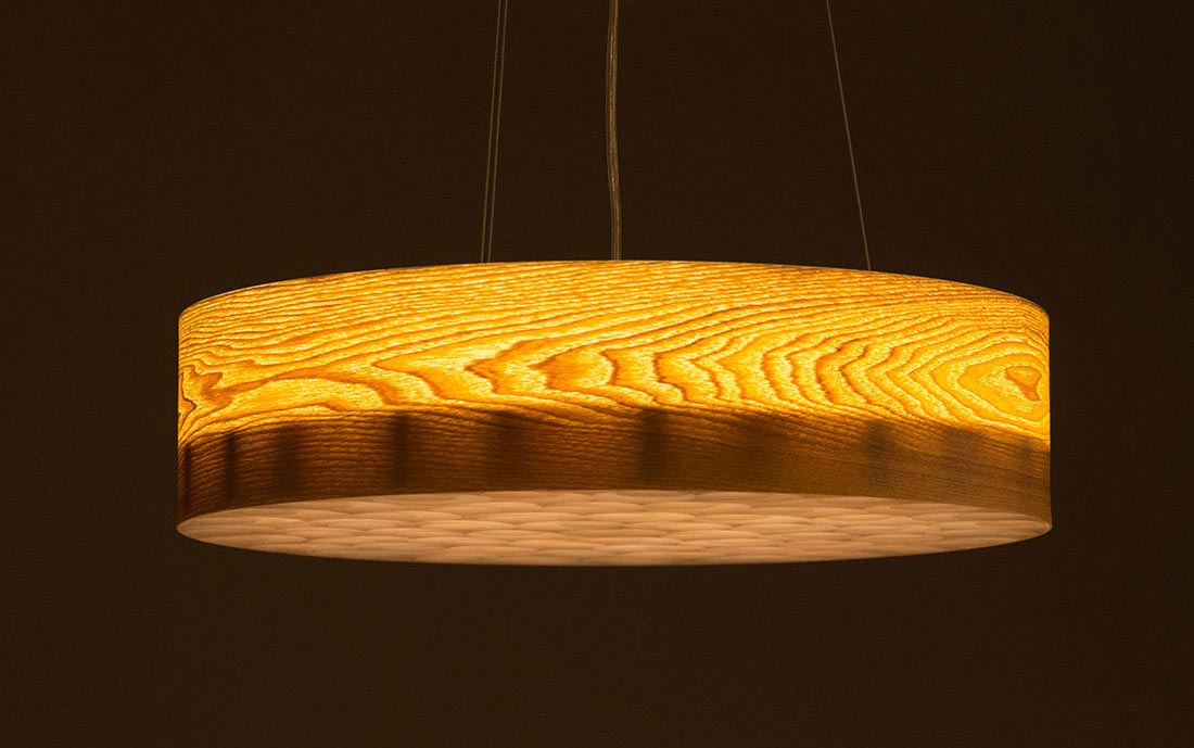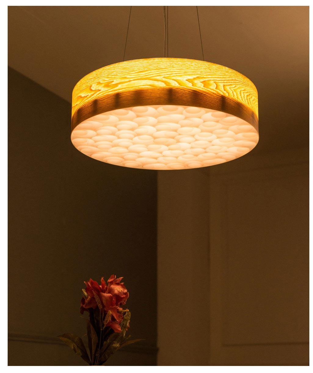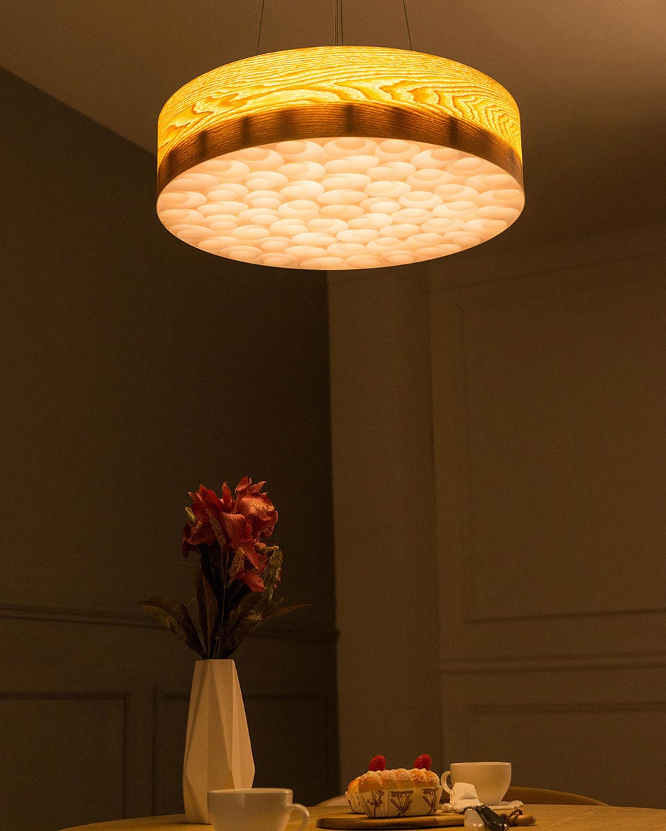 Hoa văn gỗ trở nên nổi bật dưới ánh đèn. Không chỉ chiếu sáng, chiếc đèn còn là vật trang trí hoàn hảo cho bàn ăn của gia đình bạn.