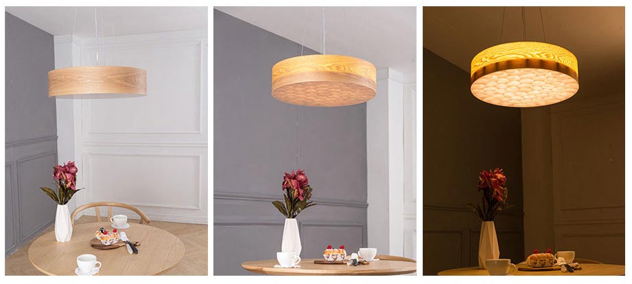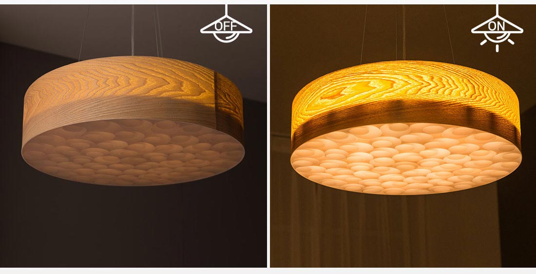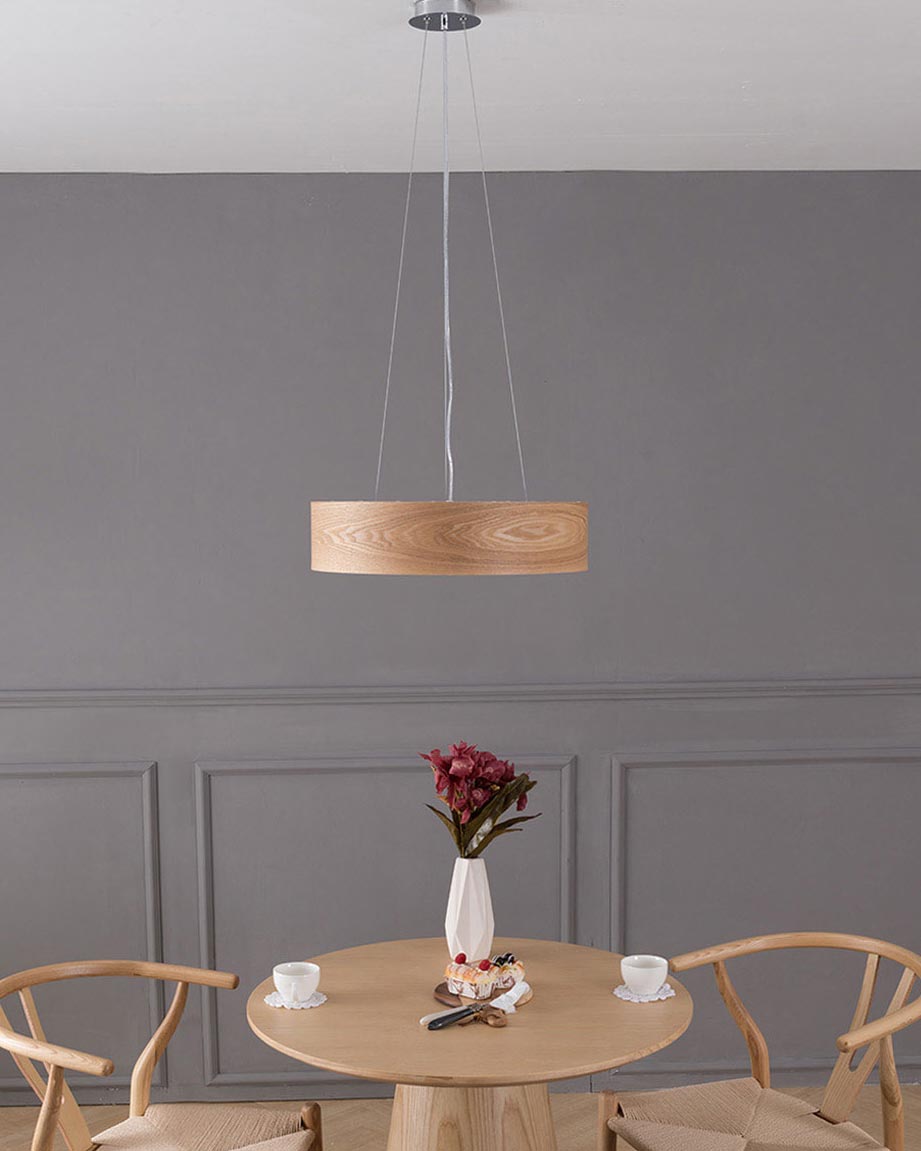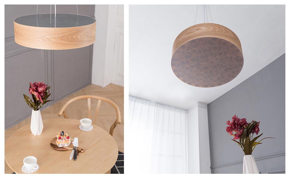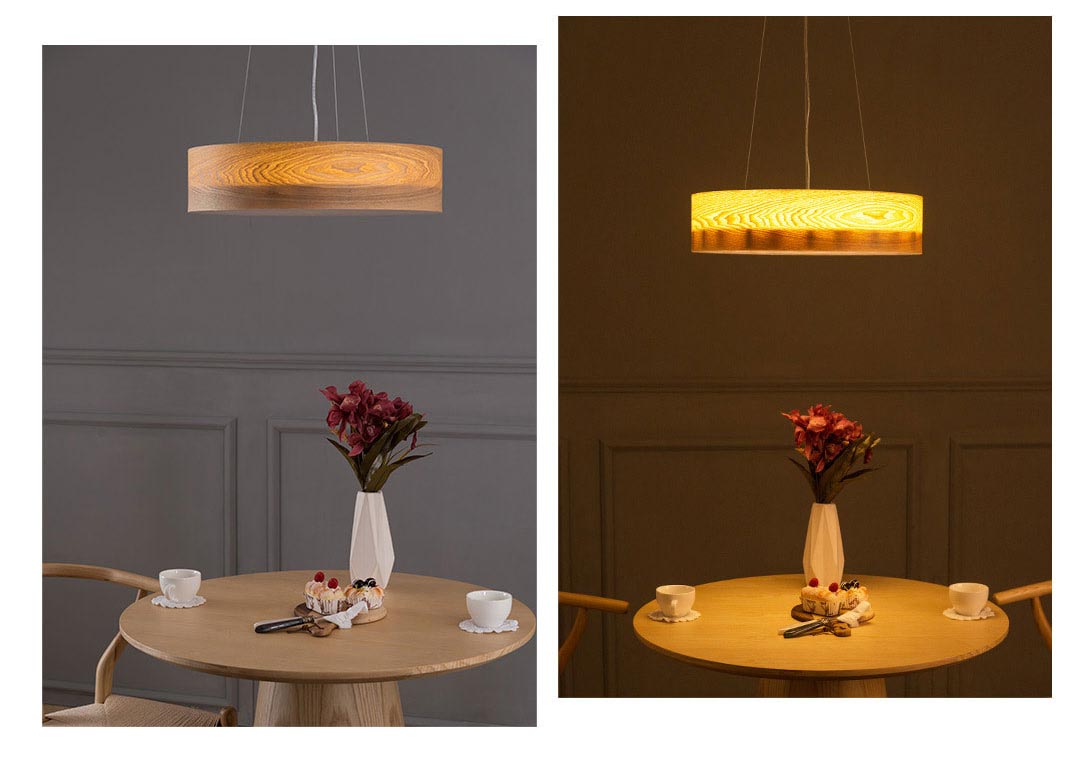 Đèn thả sử dụng gỗ với hoa văn tự nhiên, hiện đại. Chiếc đèn có kích thước 60cm phù hợp cho bàn ăn có kích thước từ 1m2 – 1m6, cho các bàn ăn khoảng từ 4 – 6 thành viền. Ánh sáng từ chiếc đèn lan tỏa đều xuống bàn ăn tạo không gian dễ chịu.