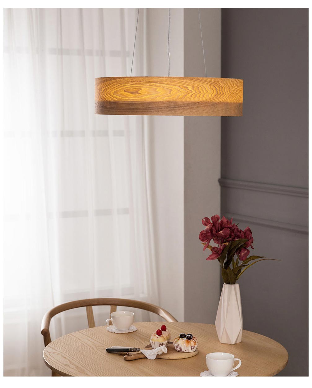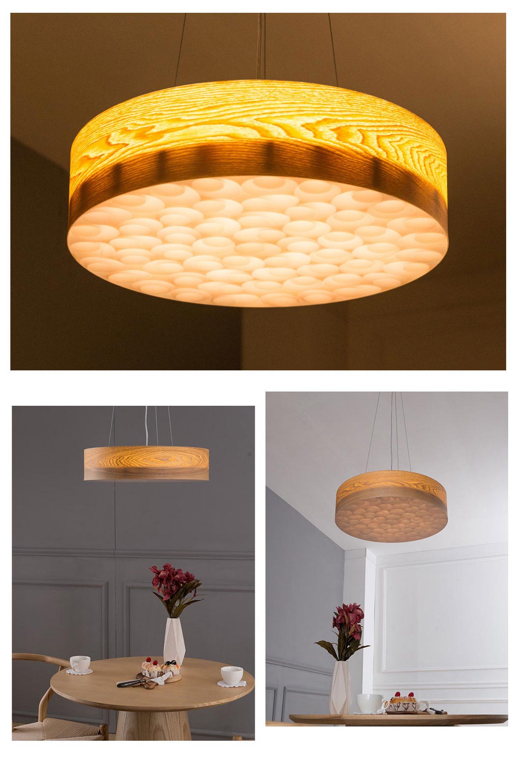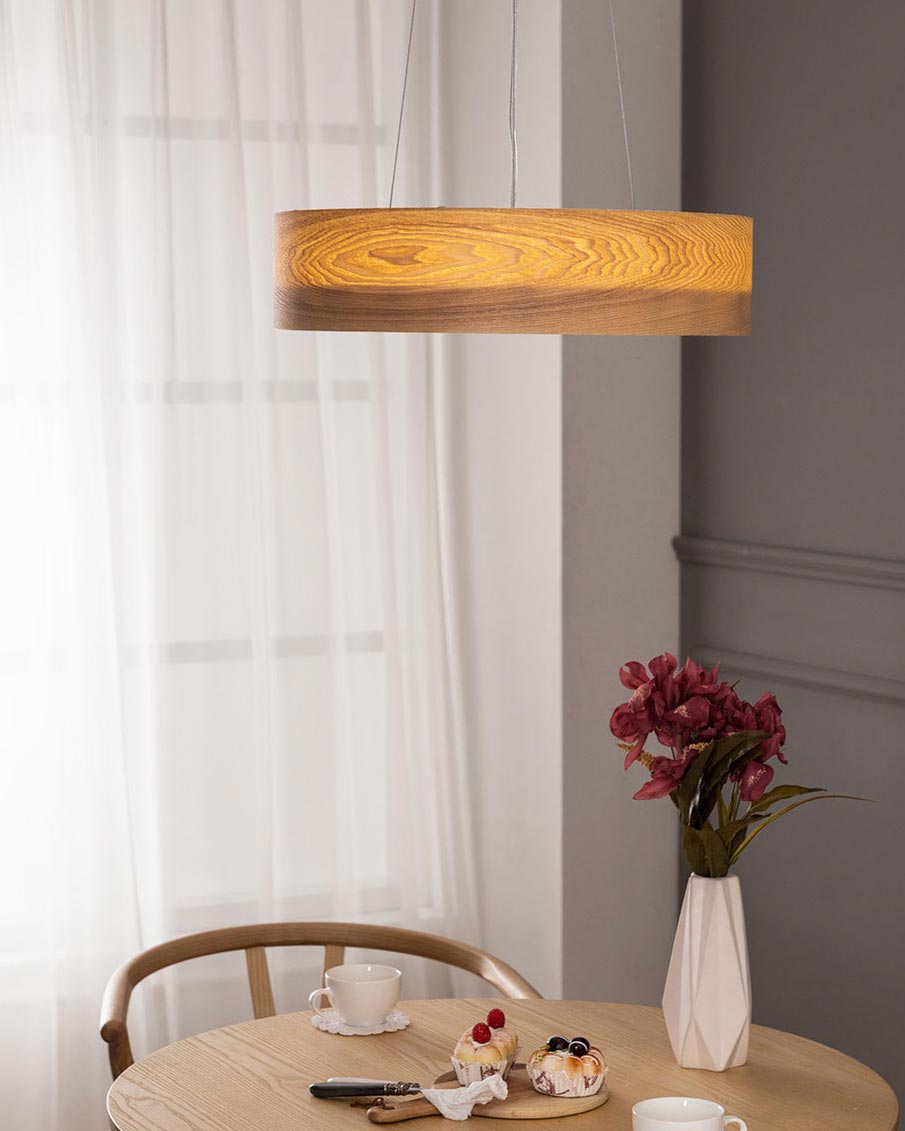 Đèn thả sử dụng gỗ với hoa văn tự nhiên, hiện đại. Chiếc đèn có kích thước 60cm phù hợp cho bàn ăn có kích thước từ 1m2 – 1m6, cho các bàn ăn khoảng từ 4 – 6 thành viền. Ánh sáng từ chiếc đèn lan tỏa đều xuống bàn ăn tạo không gian dễ chịu.