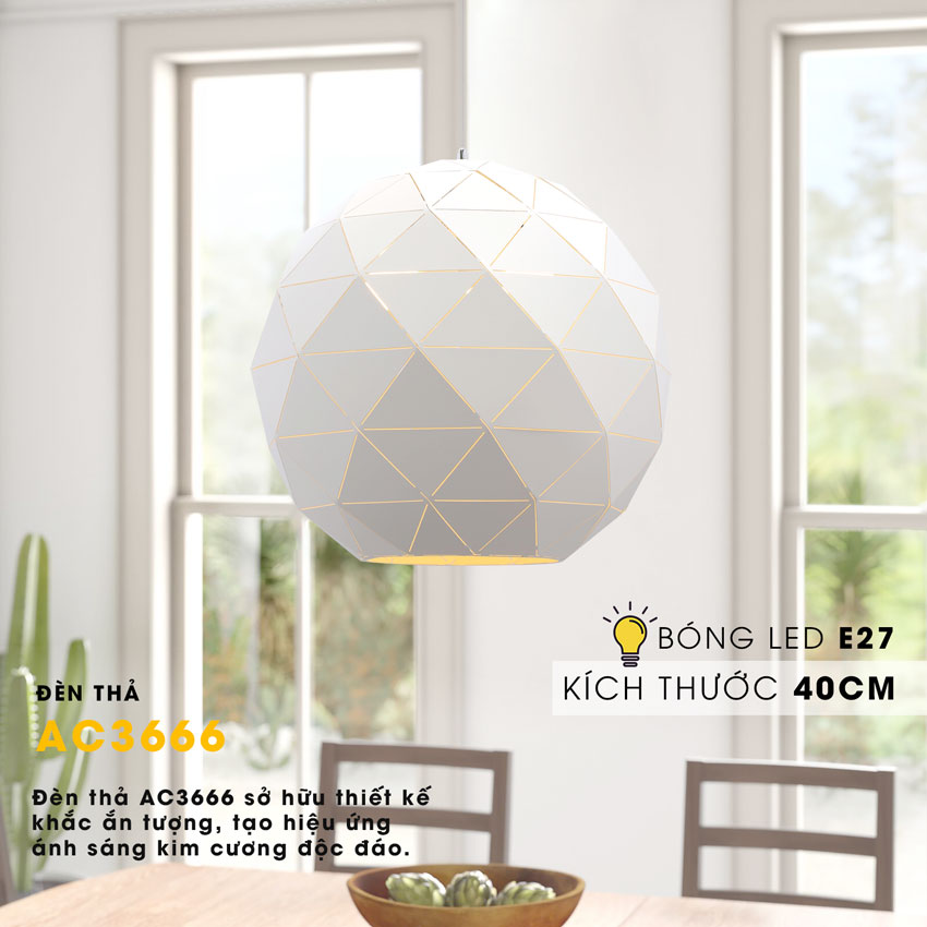 Đèn thả AC3666 có thể treo trần đế đơn hay kết hợp nhiều bộ để tạo nên vẻ đẹp vô cùng đẹp mắt. Mẫu đèn này được tin dùng tại nhiều công trình, căn hộ và nhận nhiều phản hồi khen ngợi. Đèn cũng có chất lượng hoàn thiện sinh động, chất lượng đem đến khả năng được trang bị lâu dài. Đèn thả AC3666 đổi bóng LED E27 với khả năng thay bóng thuận tiện và tùy biến loại bóng, công suất chiếu sáng.