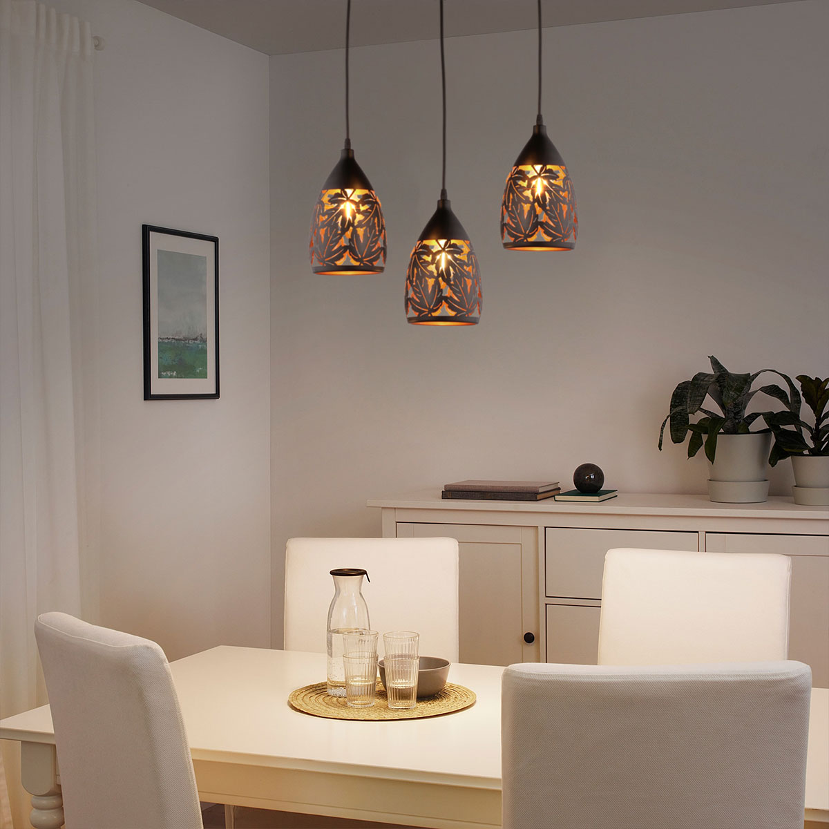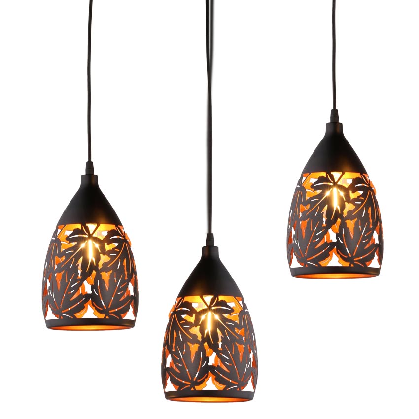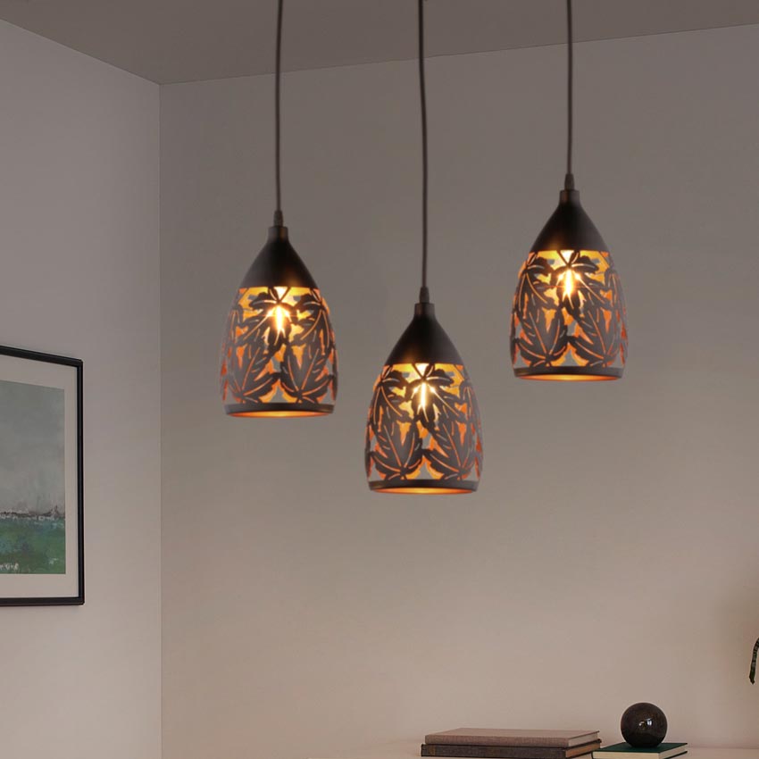 Bộ đèn thả bàn ăn bằng hợp kim vừa đem lại nét giản dị vừa đẹp mắt, thú vị cho không gian bàn ăn. Đèn sở hữu thiết kế 3 bóng với họa tiết chụp đèn kim loại khắc lá vô cùng thú vị. Bộ đèn đi kèm bóng LED ánh sáng ấm, đem lại cảm giác thư giản nhất cho các thành viên gia đình bạn. Với phong cách đơn giản, mộc mạc chiếc đèn cũng có thể ứng dụng phù hợp cho mọi phong cách bàn ăn.