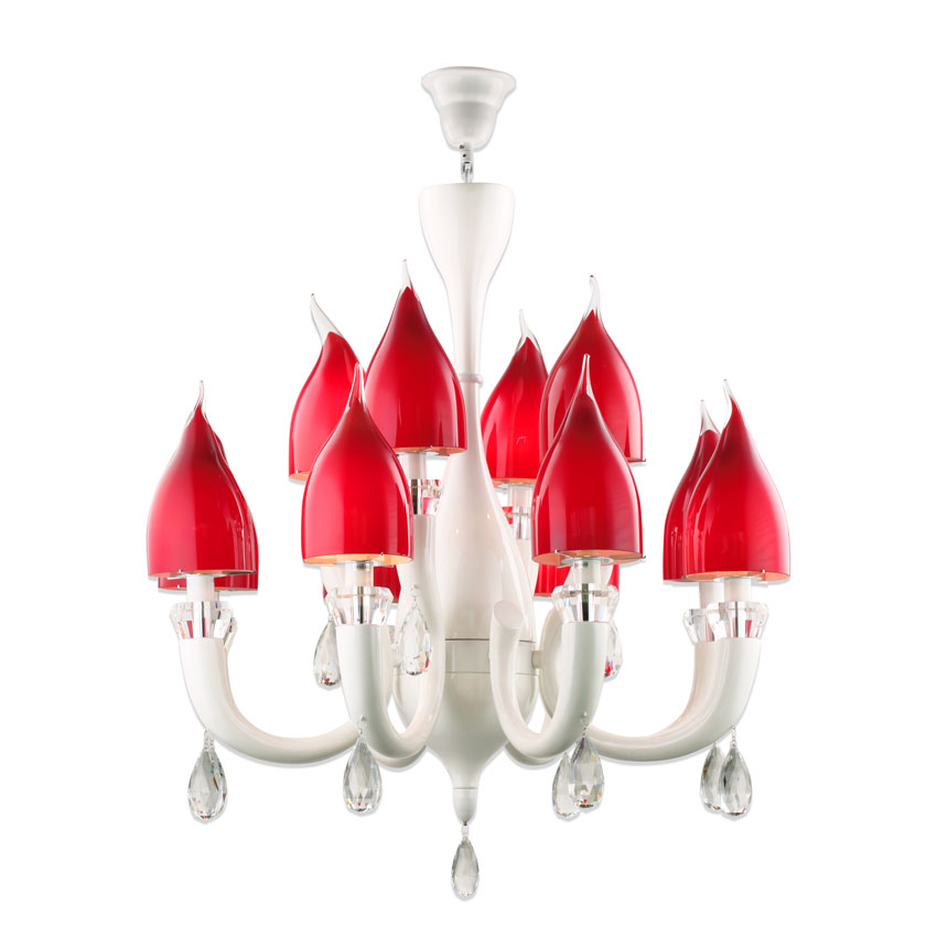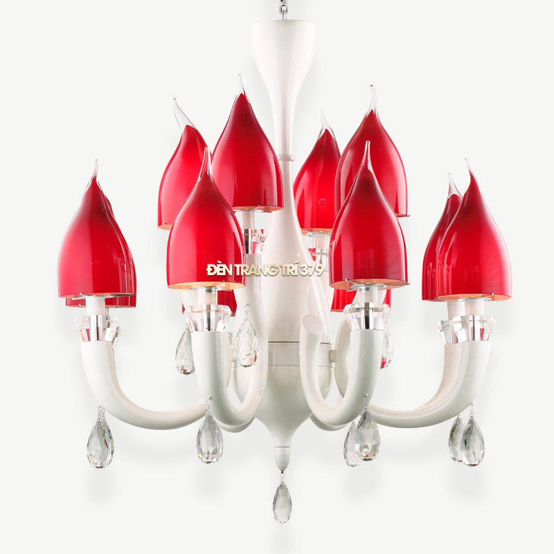 Mẫu đèn chùm 12 tay với vật liệu chính từ thủy tinh và pha lê cao cấp. Mẫu đèn được sản xuất với chất lượng cao, đem lại vẻ đẹp tinh tế và sang trọng cho không gian gia đình bạn. Các tay đèn thủy tinh được tạo hình thủ công với công nghệ thủy tinh thổi cao cấp, tạo hình hoa tu líp đỏ đầy ấn tượng.