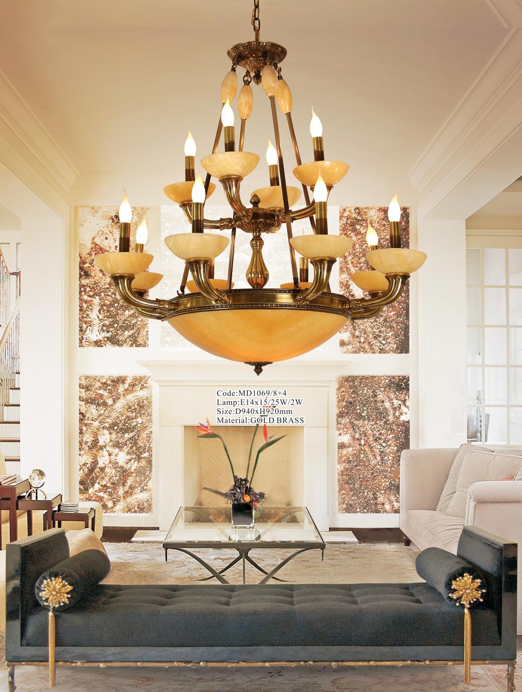 Đèn chùm đồng chao đá Tân cổ điển MD1069/8+4