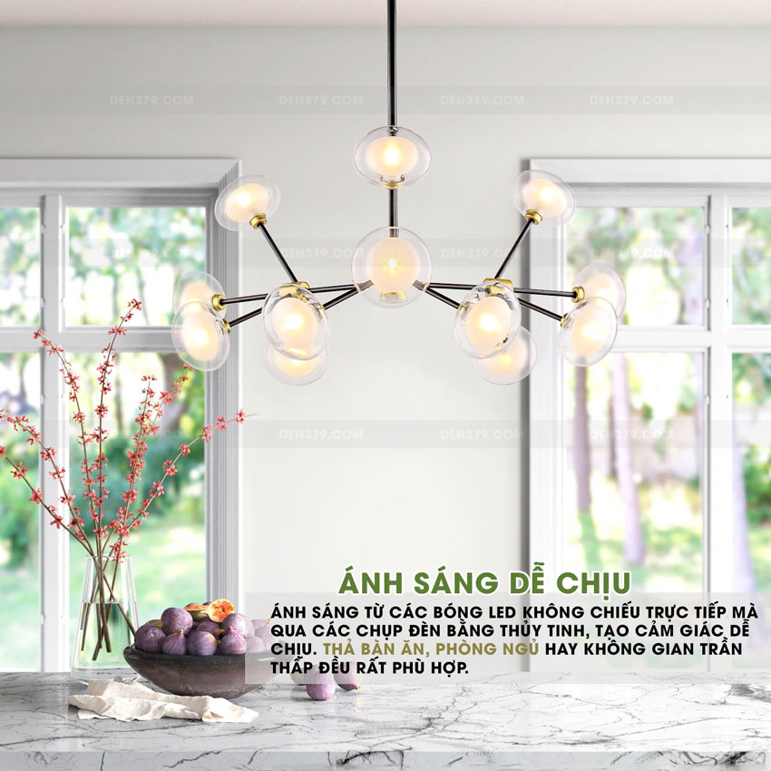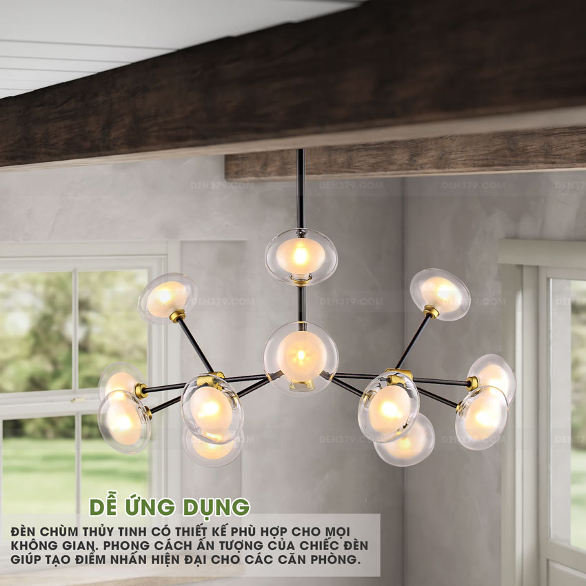 Bộ đèn thủy tinh trang trí sở hữu phong cách hiện đại và ánh sáng hấp dẫn. Các tay đèn lúc lắp đặt có thể chỉnh thành các bộ cục khác nhau. Chao đèn thủy tinh 2 lớp trong suốt và trắng đục cùng tạo hình độc đáo, điểm nhấn vẻ thú vị cho căn phòng. Bộ đèn phù hợp cho phòng khách, phòng ăn hay phòng ngủ… Sử dụng trang trí tại nhà hàng, quán ăn, cafe…