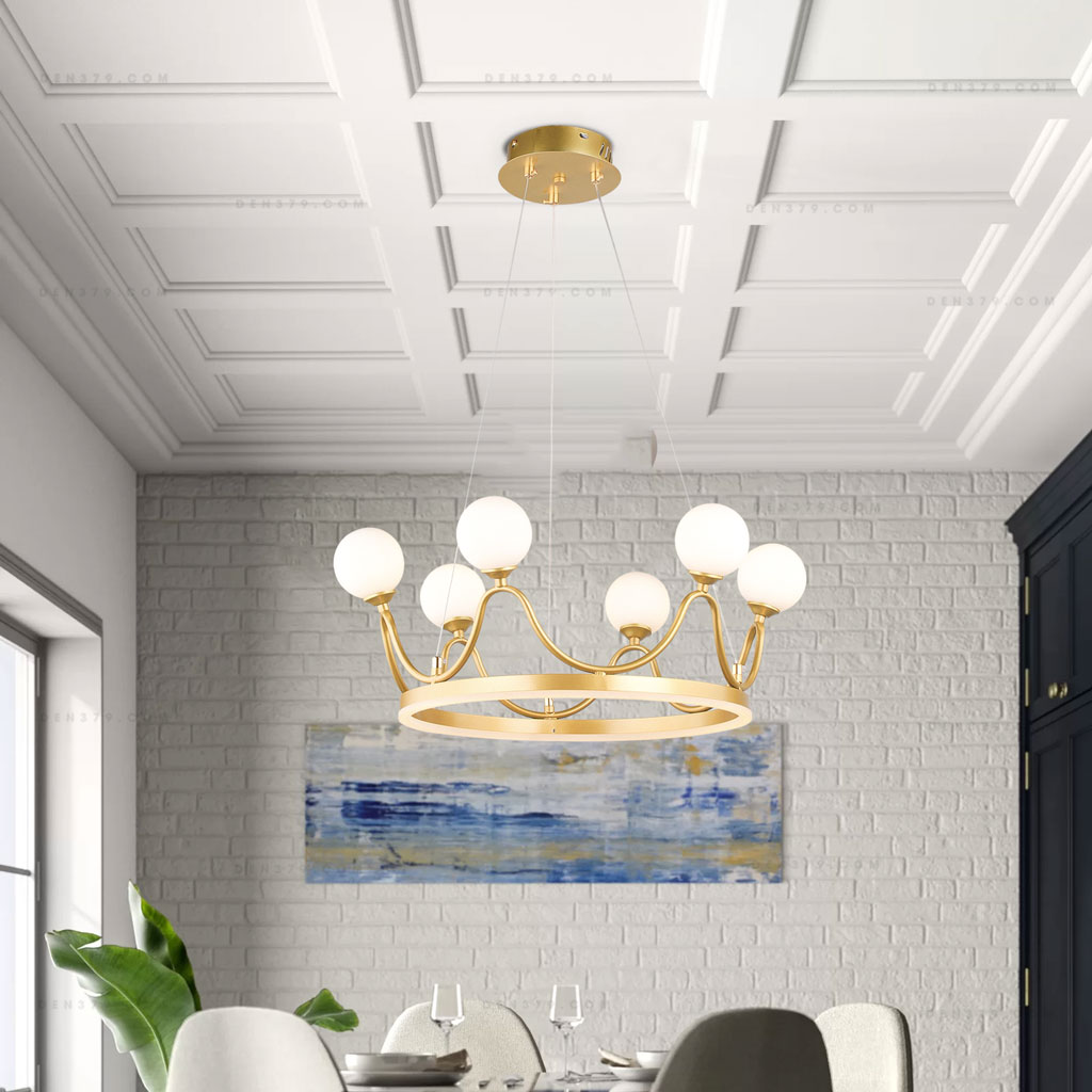 Đèn thả D1288/6 là một sản phẩm mang phong cách thiết kế mới, thú vị, độc đáo. Bộ đèn sử dụng 6 bóng với chụp thủy tinh trắng, gắn trên khung đèn hợp kim đúc tạo hình vương miệng. Sử dụng tại phòng khách, phòng ngủ hay bàn ăn… đều là những lựa chọn đầy thú vị.