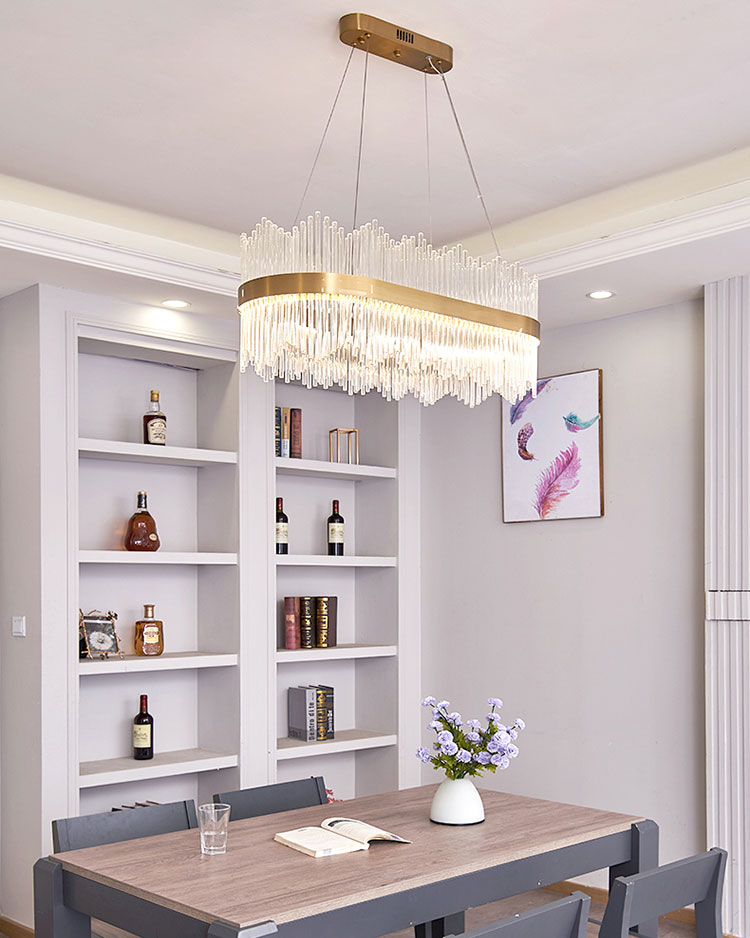 Đèn chùm pha lê với thiết kế tinh xảo từng chi tiết đem đến vẻ đẹp sang trọng, hiện đại cho không gian. Với ánh sáng vàng dịu đèn càng tăng thêm không gian ấm cúng, lãng mạn cho căn phòng. Nó sử dụng bóng đèn LED giúp tiết kiệm điện, kéo dài tuổi thọ.