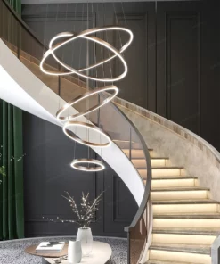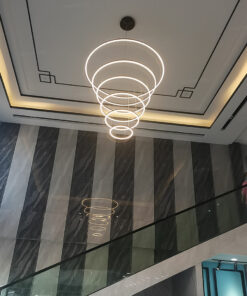 Đèn thả trang trí 5 vòng tròn LED D7051T5 là một trong những sản phẩm đèn trang trí cao cấp được thiết kế với 5 vòng tròn có kích thước khác nhau, tạo nên một hiệu ứng ánh sáng độc đáo và sang trọng. Với chiều rộng 120cm và chiều cao 250cm, đèn thả này thích hợp để sử dụng cho các không gian nội thất như phòng khách lớn, thông tầng cầu thang, phòng tiệc hay các khu vực đón khách trong nhà hàng, khách sạn. Vật liệu chính được sử dụng để sản xuất đèn thả này là hợp kim sơn tĩnh điện và nhựa PMMA, tạo nên độ bền cao và tính thẩm mỹ đẹp mắt. Chụp đèn được làm bằng nhựa PMMA, làm mềm ánh sáng và giảm bóng đèn, tăng độ sáng và độ bền của đèn thả.