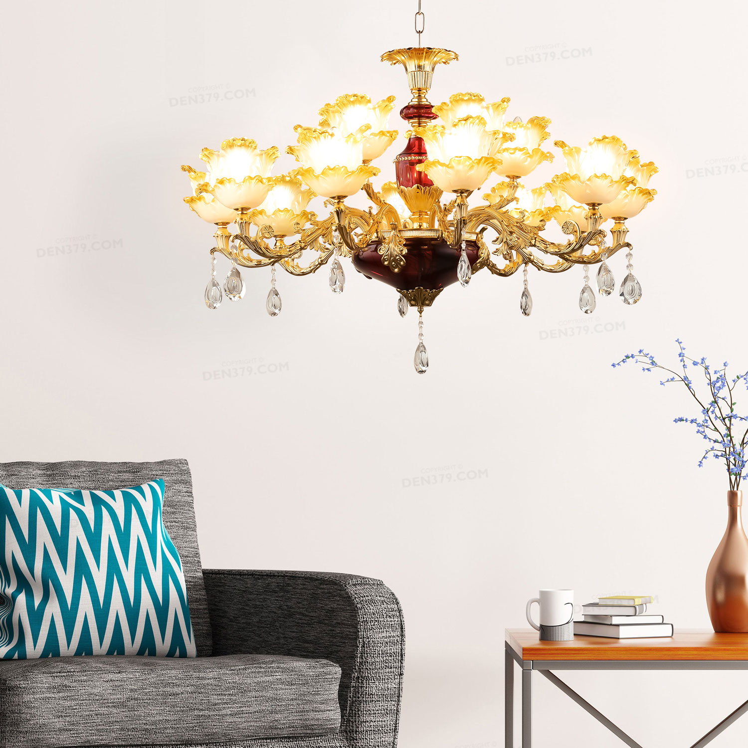 - Đèn chùm thủy tinh phong cách cổ điển D231/15 được thiết kế với các chi tiết tinh tế và sắc sảo, từ đường cong trang trí đến các bông hoa cách điệu được làm từ thủy tinh.