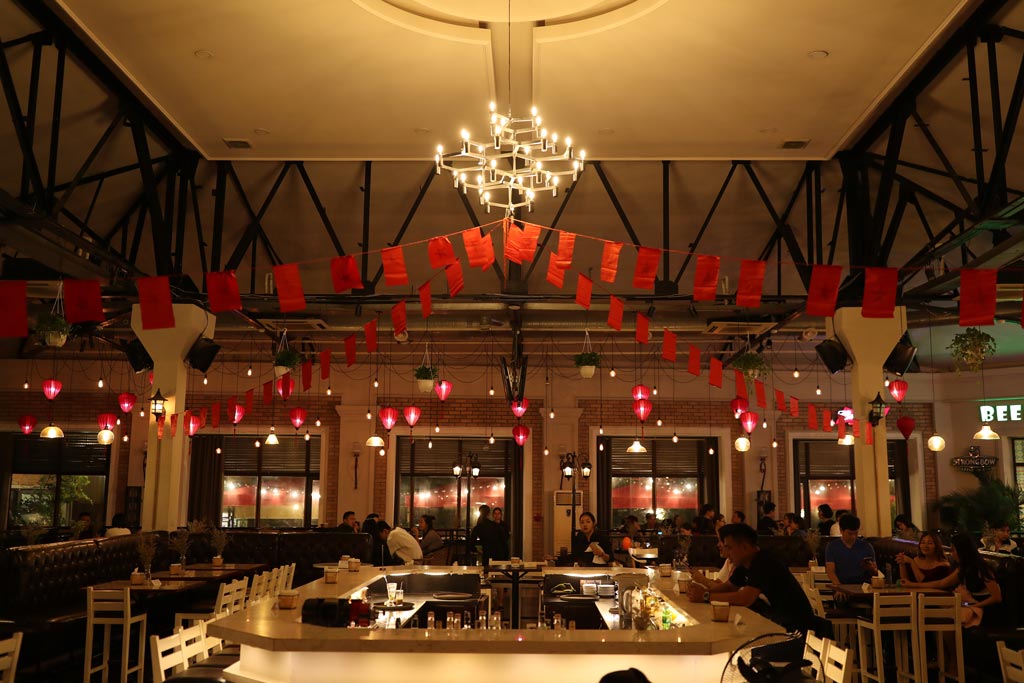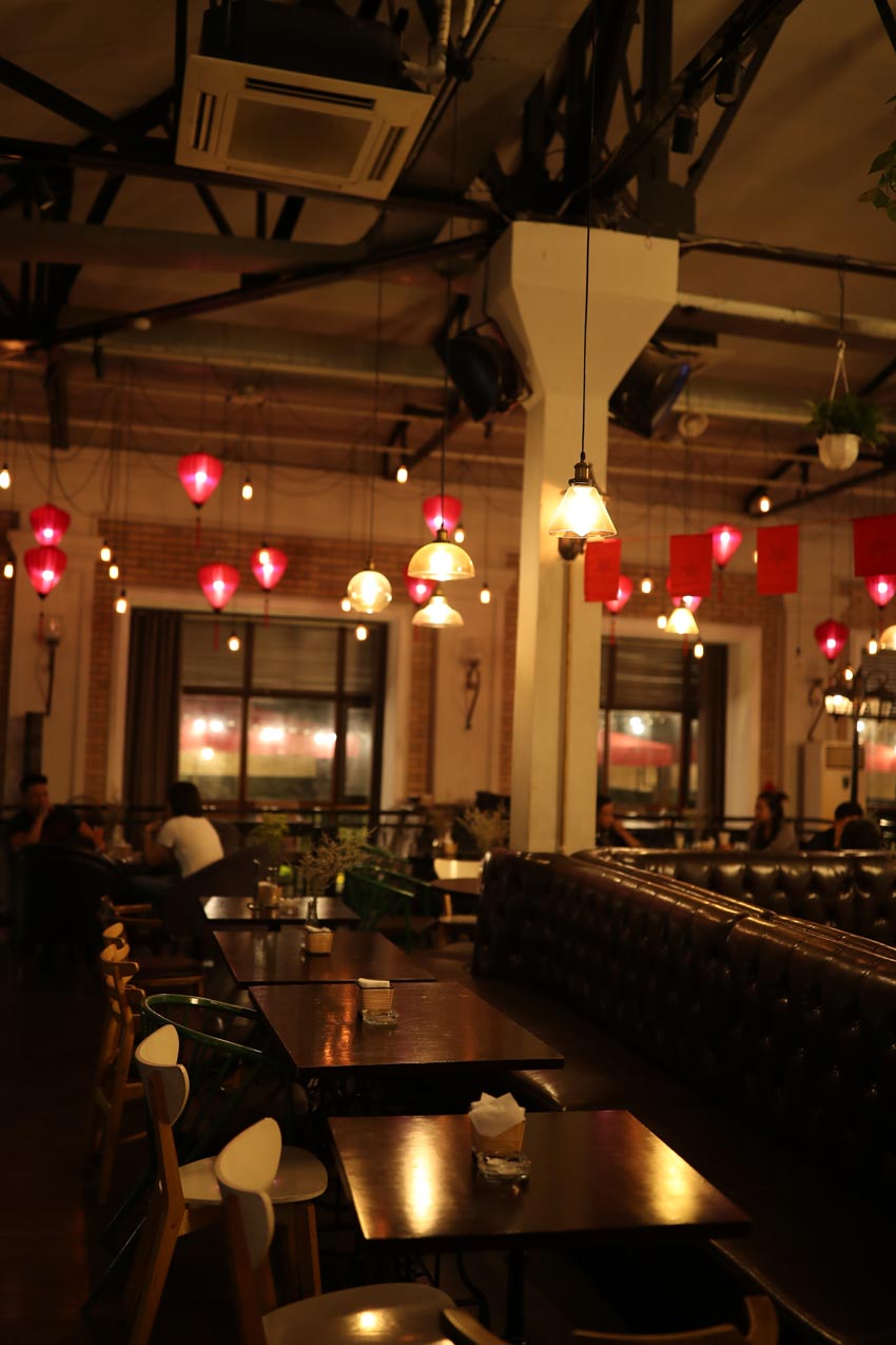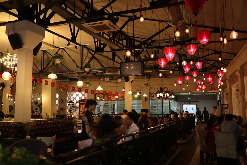 Ngoài sử dụng những bộ đèn thả chóa thủy tinh, đèn lồng bằng vải truyền thống cũng được quán sử dụng cho một khu vực riêng. Màu đỏ làm tăng phần nhộn nhịp náo nhiệt sôi động của quán. Quán còn có chương trình ca nhạc hằng đêm, khách ngồi khu vực trung tâm ngoài thưởng thức đồ ăn thức uống tuyệt với, những bộ đèn chùm đẹp lung linh, còn được thưởng thức những bài hát do những ca sĩ tên tuổi Việt Nam đương thời trình bày.